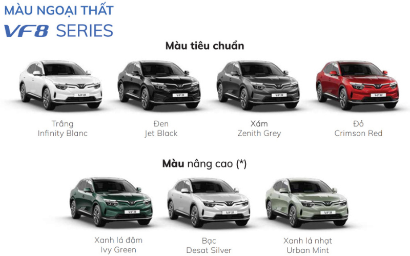 Tổng Quan VF8 Eco VF8 Plus Màu sắc 4 màu tiêu chuẩn và 3 màu nâng cao 4 màu tiêu chuẩn và 3 màu nâng cao Công suất 201 hp 402 hp Quãng đường di chuyển 562 km (theo NEDC) 457km (theo WLTP) Trợ lý ảo Trợ lý ảo ViVi Trợ lý ảo ViVi